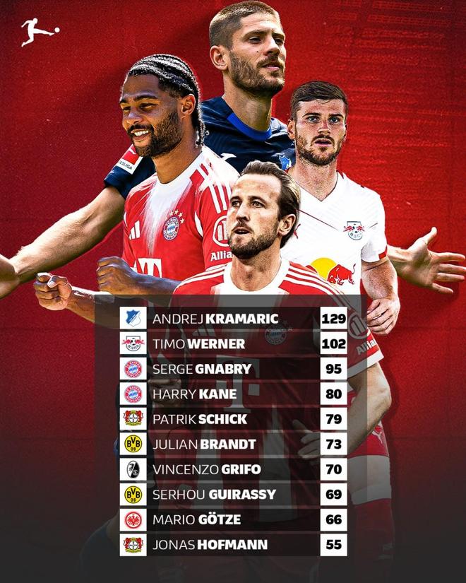 现德甲进球数前10球员:克拉马里奇129球第1,凯恩80球第4